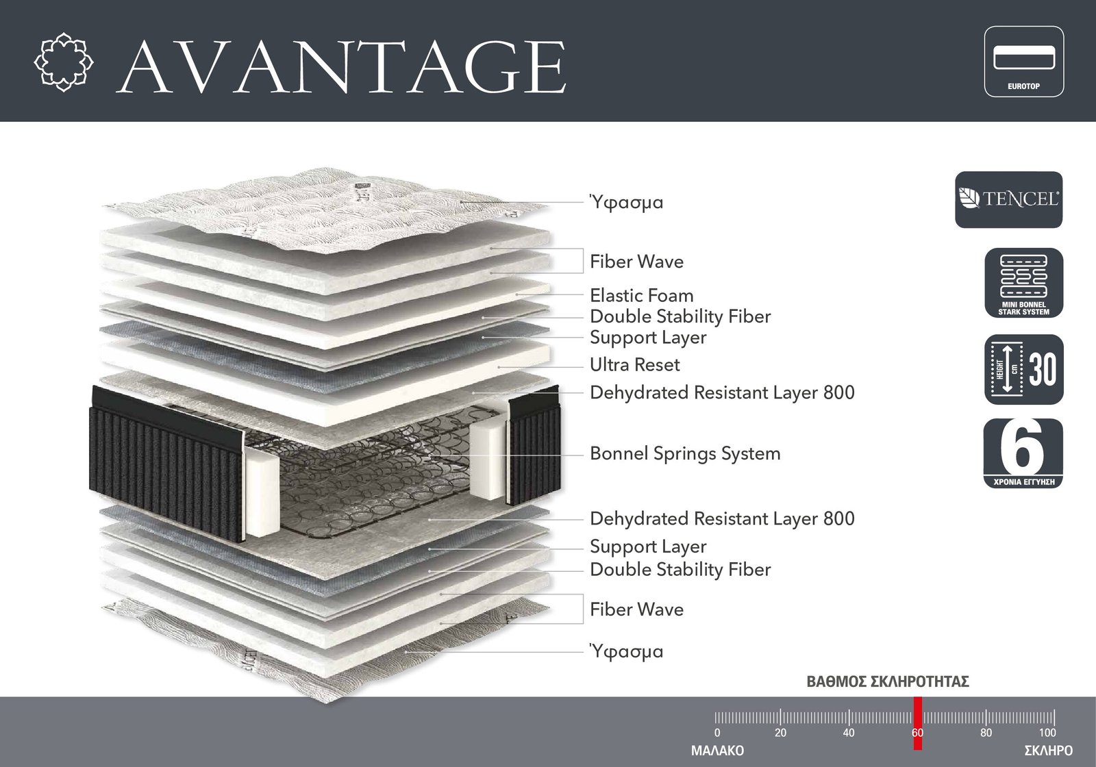 Εξοπλισμένο με ίνες Tencel από φυσική πρώτη ύλη οξιάς, το στρώμα Avantage δεν είναι απλώς άνετο – είναι και υγιεινό. Οι ίνες αυτές διαθέτουν εξαιρετικές ιδιότητες απορρόφησης υγρασίας, προλαμβάνοντας τη συγκέντρωση βακτηριδίων και διατηρώντας το στρώμα σας καθαρό και φρέσκο. Η φυσική υφή τους προσδίδει μια απαλή αίσθηση, απαλή στη δέρμα σας, ιδανική για ευαίσθητες επιδερμίδες. Επιπλέον, οι αντιαλλεργικές ιδιότητες των υλικών καθιστούν το στρώμα κατάλληλο για όλους.