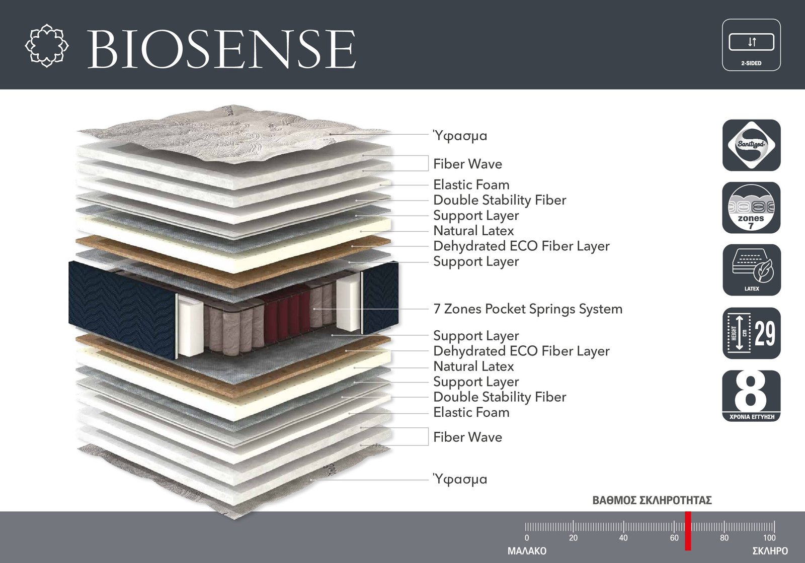Το Biosense στρώμα δύο πλευρών σας επιτρέπει να επιλέξετε την πλευρά που σας ταιριάζει καλύτερα. Με διαφορετική σκληρότητα σε κάθε πλευρά, μπορείτε να αλλάζετε πλευρές ανάλογα με τις προσωπικές σας προτιμήσεις ή τις εποχικές ανάγκες. Επιπλέον, η υψηλή ποιότητα των υλικών του εγγυάται την μακροχρόνια απόδοση και την ανθεκτικότητα του προϊόντος.