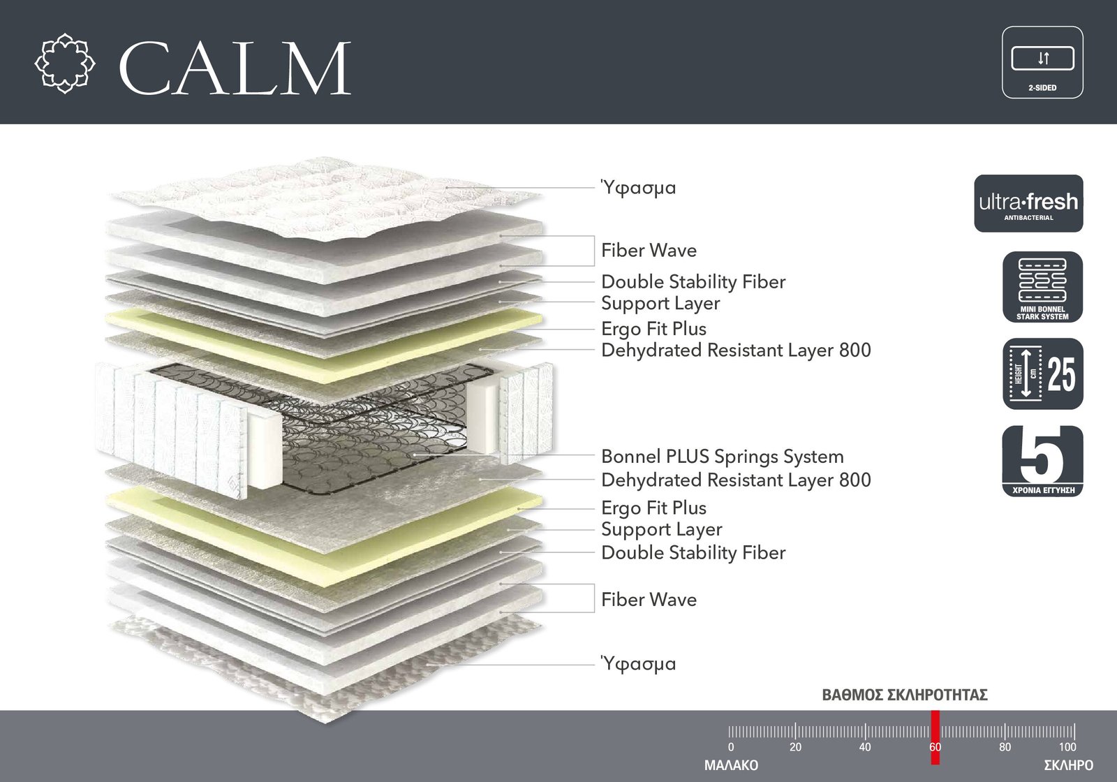 Το Calm στρώμα διαθέτει τη μοναδική αντιβακτηριακή τεχνολογία Ultra-Fresh, η οποία εγγυάται υψηλά επίπεδα υγιεινής και αντοχής. Το στρώμα σας προστατεύεται από μικρόβια και αλλεργιογόνες ουσίες, προσφέροντας ένα υγιές περιβάλλον. Επιπλέον, ο βαθμός σκληρότητας του 60% το κατατάσσει ως μετριο-σκληρό, εξασφαλίζοντας εξισορρόπηση ανάμεσα στη σταθερότητα και την ελαστικότητα, ιδανική για όσους αναζητούν ανεση και υποστήριξη.