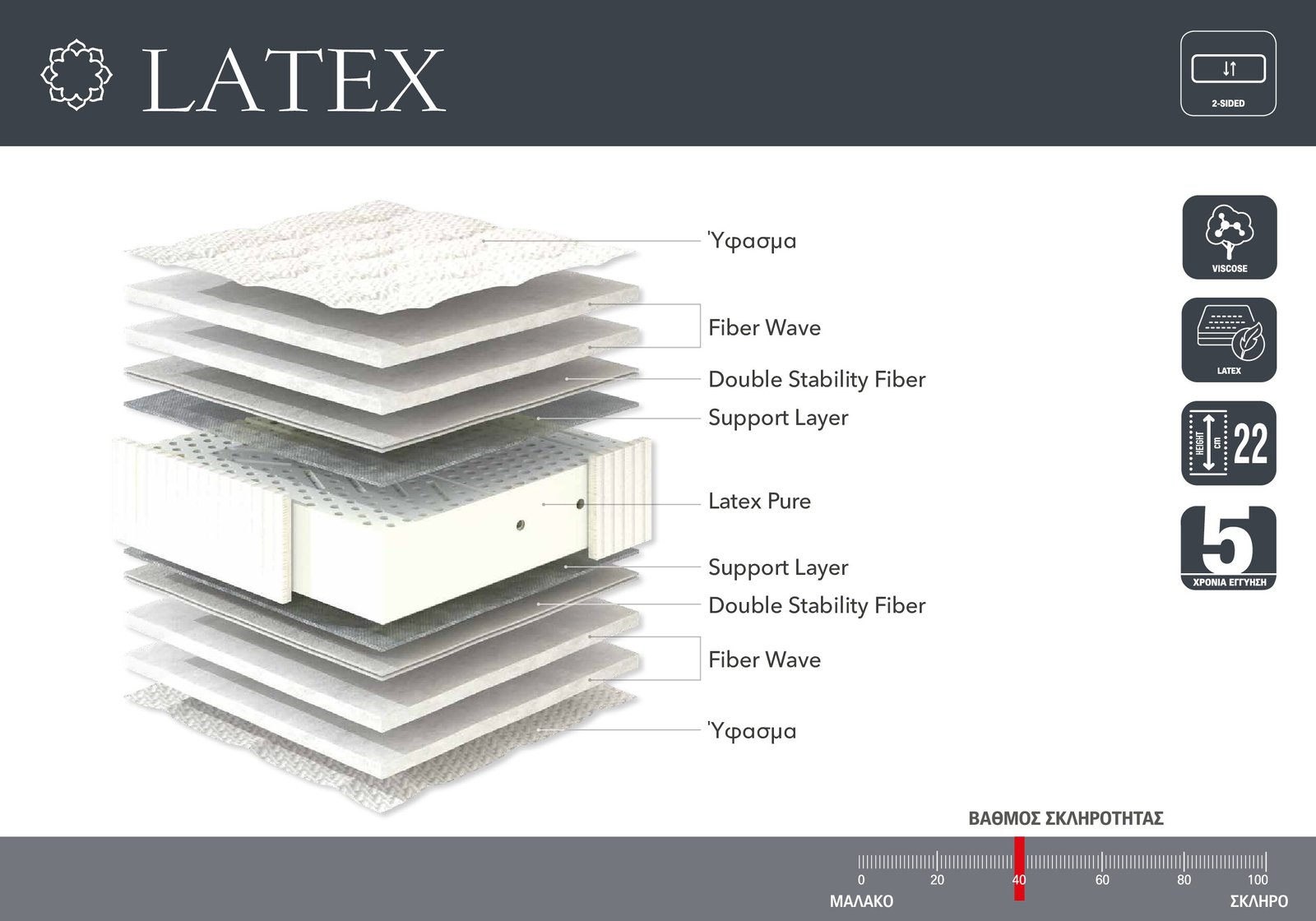 Η Linea Strom παρέχει πενταετή εγγύηση στο LATEX στρώμα, προσφέροντάς σας ηρεμία για τη μακροχρόνια χρήση του. Η στιβαρότητα και η αξιοπιστία του προϊόντος το καθιστούν ιδανικό για καθημερινή χρήση, ενώ οι προσεγμένες λεπτομέρειες εξασφαλίζουν υγιεινό και αναπαυτικό περιβάλλον ύπνου.