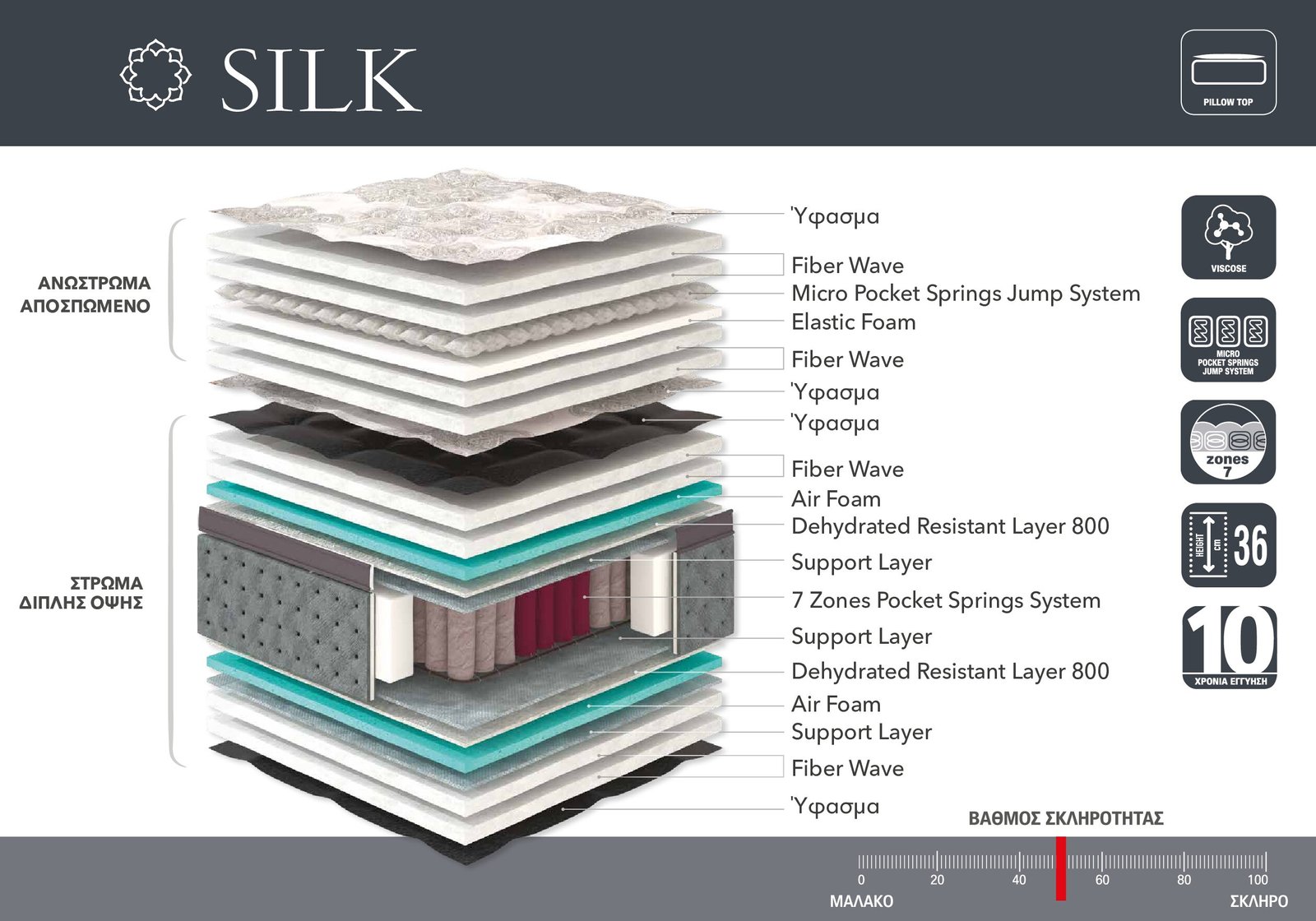 Η ποιότητα κατασκευής του Silk στρώματος ξεχωρίζει, προσφέροντας ανθεκτικότητα και μακροχρόνια απόδοση. Η εγγύηση 10 χρόνων που συνοδεύει το προϊόν επιβεβαιώνει τη δέσμευση προς τους πελάτες για αξιοπιστία και αντοχή. Ανεξαρτήτως χρήσης, το Silk στρώμα παραμένει σε καταπληκτική κατάσταση, διατηρώντας την άνετη αίσθηση και την υποστήριξη που χρειάζεστε για να ξεκινήσετε την ημέρα σας γεμάτοι ενέργεια.